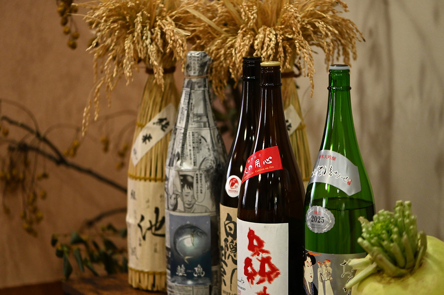 お料理をよりお楽しみいただきたいという思いから、地元『池』の有志の方々が育てた酒米を使用した日本酒をはじめ、日本各地の美味しい日本酒、ワイン、焼酎をご用意しております。